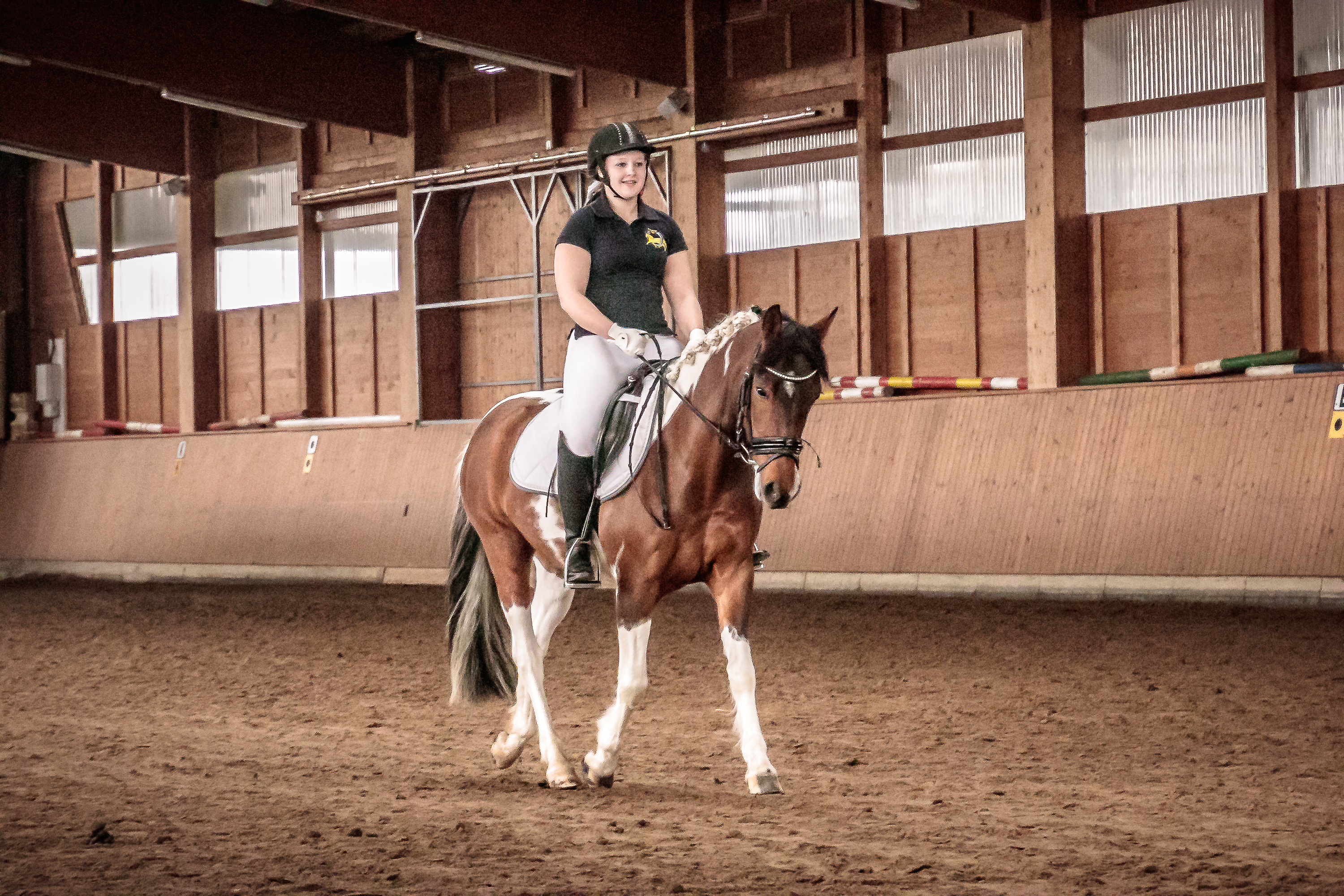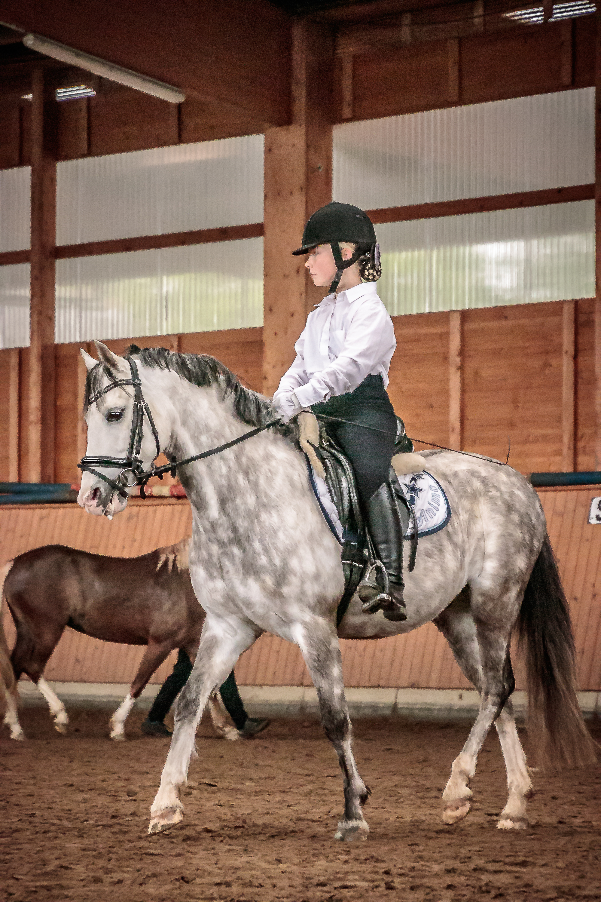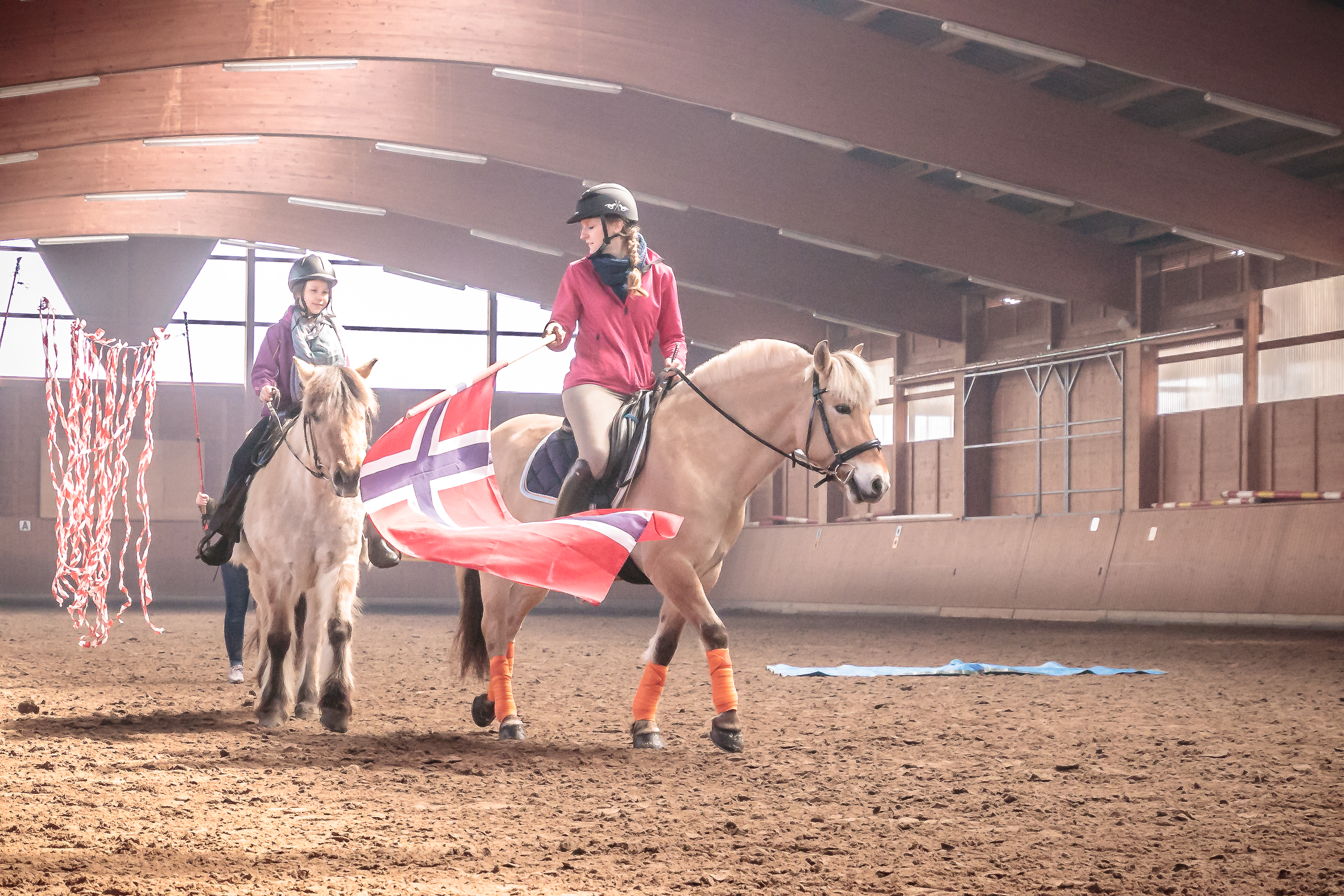 Aus der Zucht von Walter Arlt stammt die 25-jährige Fjordstute „Mira“, die bei Familie Kloiber als Familienpony unterwegs ist und schon dem einen oder anderen unerfahrenen Reiter einen sicheren Ausritt ermöglich hat. Vorgestellt wurde sie von Celine Binder (11), die zum ersten Mal auf ihr saß. Der achtjährige Wallach „Otis“ aus der Zucht von Familie Lüer nimmt mit seiner Besitzerin Lena Skopek hauptsächlich an Freizeit-Turnieren oder Distanzritten teil. Die raschelnde Plane, die wehende Fahne sowie knallende Luftballons störten die beiden Fjords nicht, sondern diese demonstrierten die besondere Gutmütigkeit dieser Rasse hervorragend.
